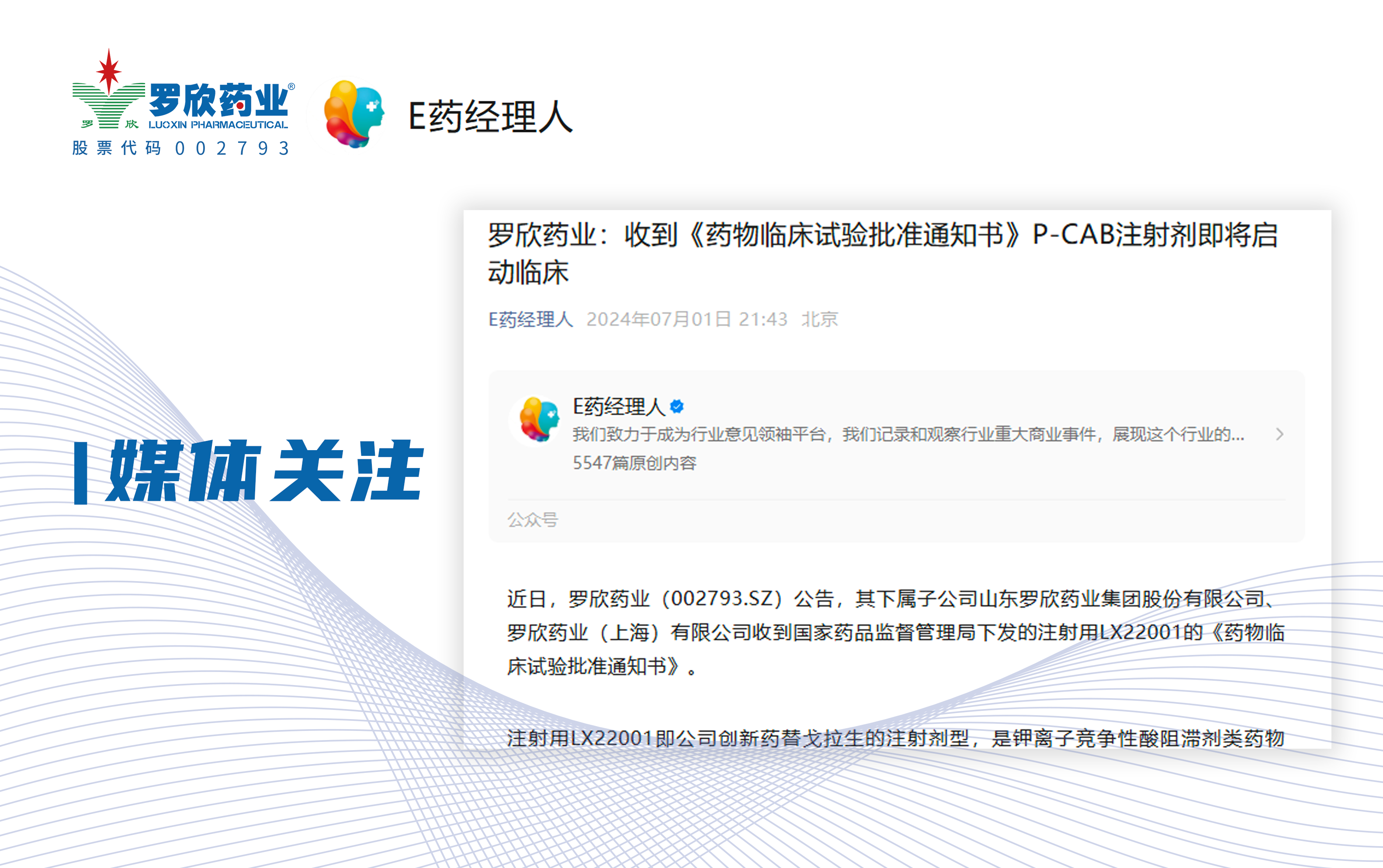 医药经济报报道|罗欣药业深耕国内百亿抑酸剂市场,注射用LX22001获批开展临床试验