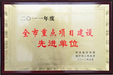 近日,中共临沂市委、临沂市人民政府公布了关于表彰2011年度全市重点项目建设先进区县开发区和先进单位的通报,我公司荣获“2011年度全市重点项目建设先进单位”荣誉称号。